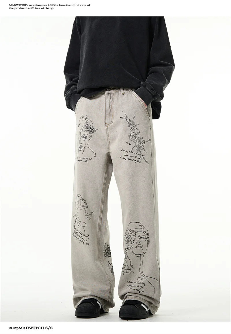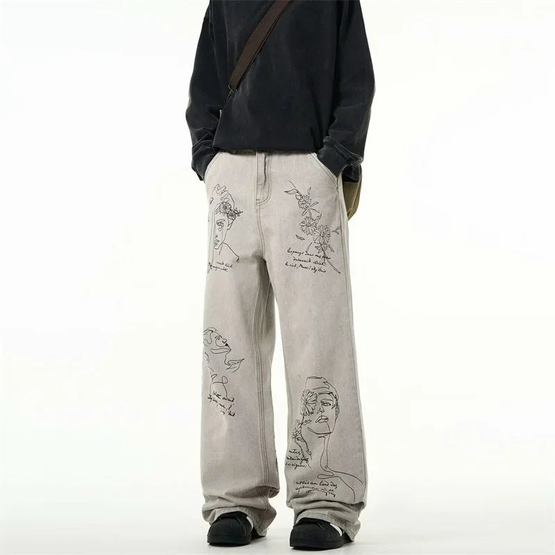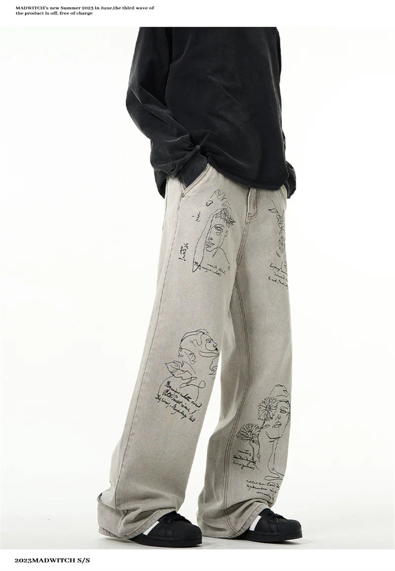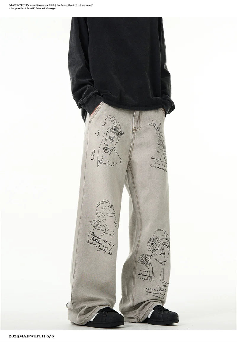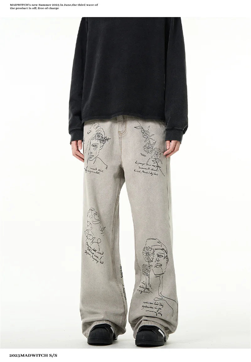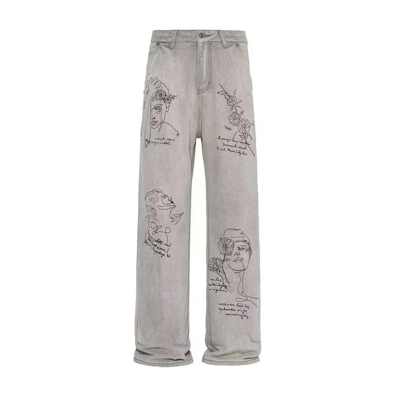 جينز مطبوع عليه رسومات جرافيتي أمريكية عتيقة
