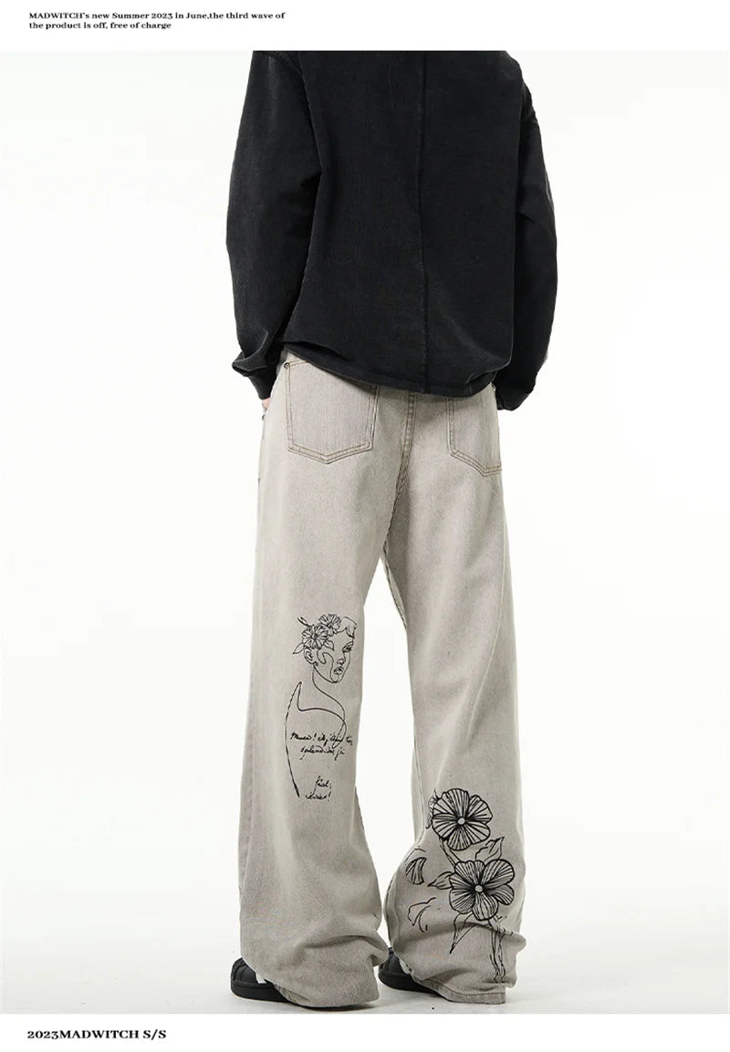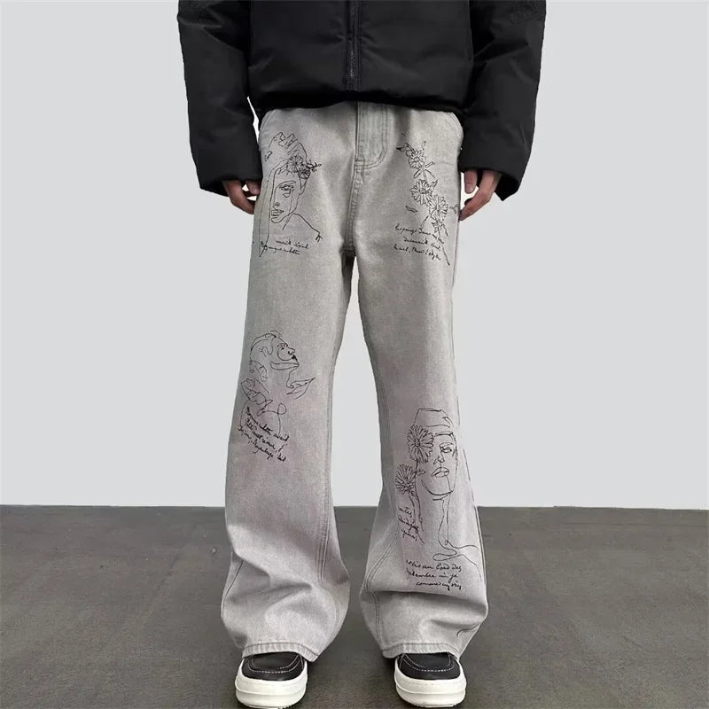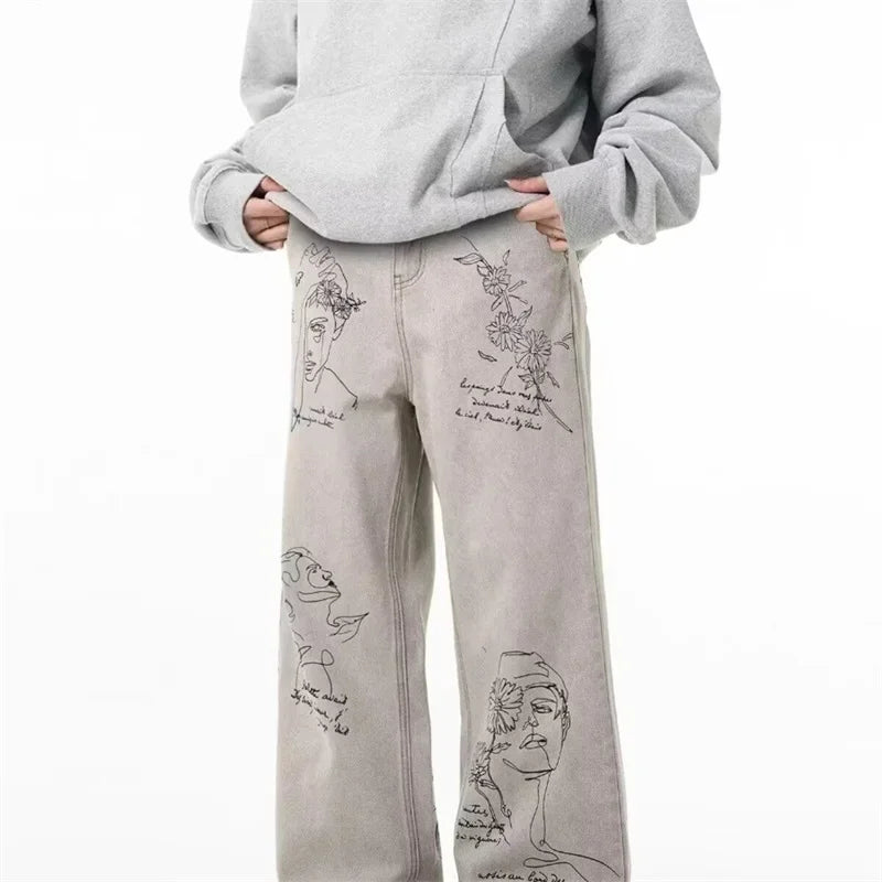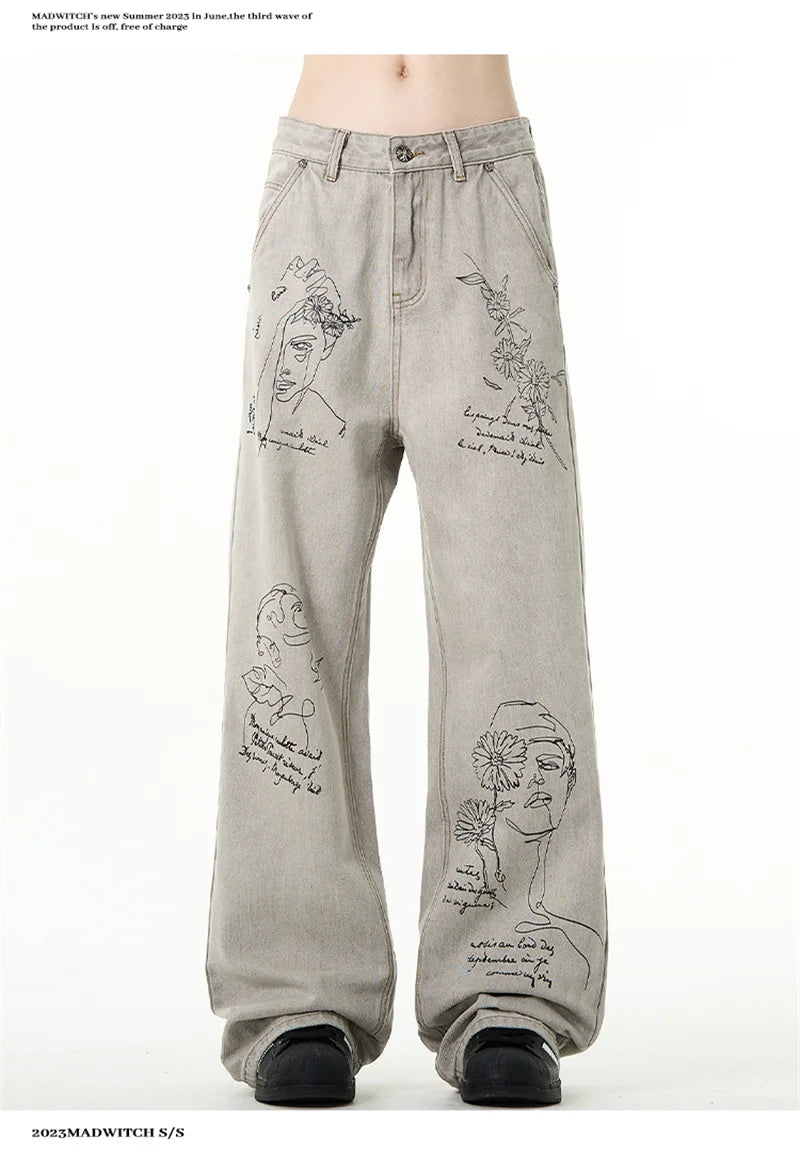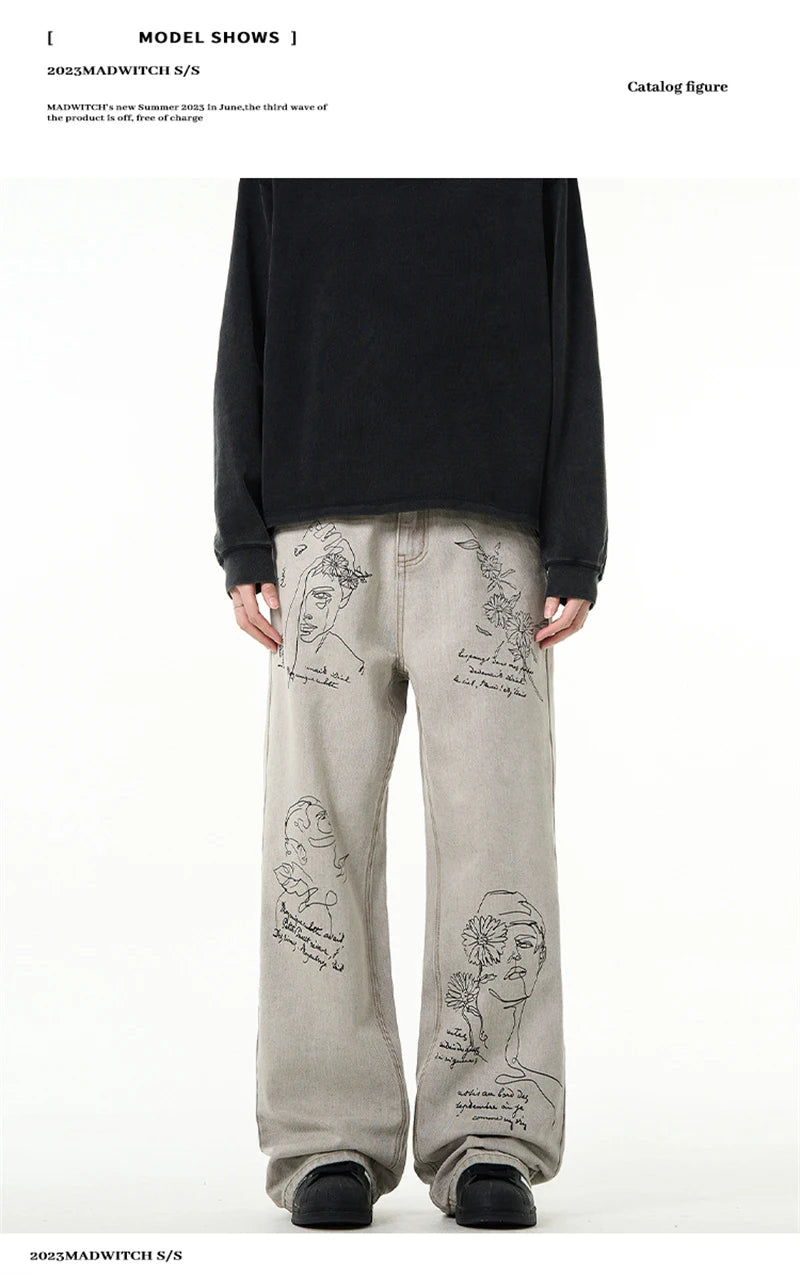 جينز مطبوع عليه رسومات جرافيتي أمريكية عتيقة